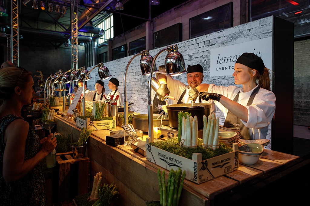 Zum 10-jährigen Jubiläum des Cologne Convention Bureau konnten sich 400 geladene Gäste in der Motorworld Köln | Rheinland von lemonpies kreativem Know-how überzeugen. Mit einem offenen „Marktplatz kulinarischer Genüsse“ bekam das Fachpublikum einen überzeugenden Einblick sowohl in die Vielseitigkeit der Eventfläche als auch der Kochkunst. Angefangen von Warm-ups wie Spargel-Panna-cotta oder Crevette rose mit Lavendel und Papaya über Kalbsrücken mit Bärlauch Püree und Pilzgremolata bis hin zu Spargel-Risotto oder Roulade vom Bachsaibling mit Sauerampfer-Ravioli zeigte lemonpie beim Frontcooking live, was möglich ist. Und das ist noch lange nicht alles.
