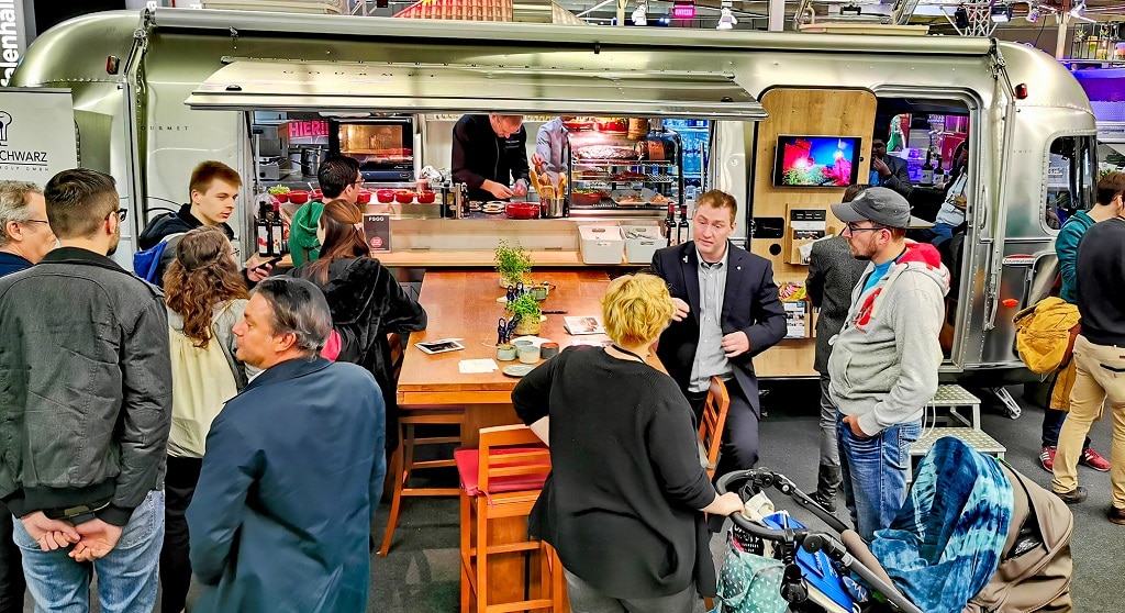 Bereits seit Anfang des Jahres setzt die FSGG zudem auf ihr „Airstream-Diner“. Mit dem amerikanischen Genusswagen möchten die Duisburger Streetfood auf dem Silbertablett präsentieren. „Er wird vor allem als modernes Pop-up-Restaurant auf exklusiven Veranstaltungen in ganz Deutschland eingesetzt“, sagt Frank Schwarz. Im Loungebereich können VIP-Gäste am Chef‘s Table Platz nehmen und die Spezialitäten aus Küche und Keller genießen. Herzstück des 8,20 Meter langen Gefährts ist die voll ausgestattete Küche, in der sich Küchendirektor und Sternekoch Roger Achterath bei kulinarischen Sondereinsätzen verwirklichen kann. Mit diesem Konzept ist die FSSG nach Angaben des Geschäftsführers einzigartig auf dem Cateringmarkt.