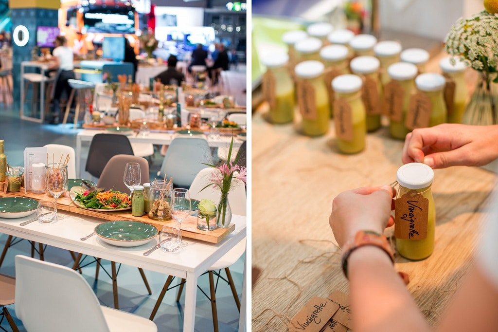 Zum Beispiel beim Friends&Family-Day: Da hieß es passend zum Anlass: „Freunde, zu Tisch!“. Gesellig scharten sich die Gäste um modern und stilvoll gedeckte Tische. Die Speisen standen auf Platten, in Schüsseln und dekorativen großen Gläsern bereit. Man reichte sich an, tat sich gegenseitig auf, kam entspannt und locker ins Gespräch. Eine Stimmung wie in einer riesengroßen Wohnküche – für ein Messe-Catering eher ungewöhnlich.