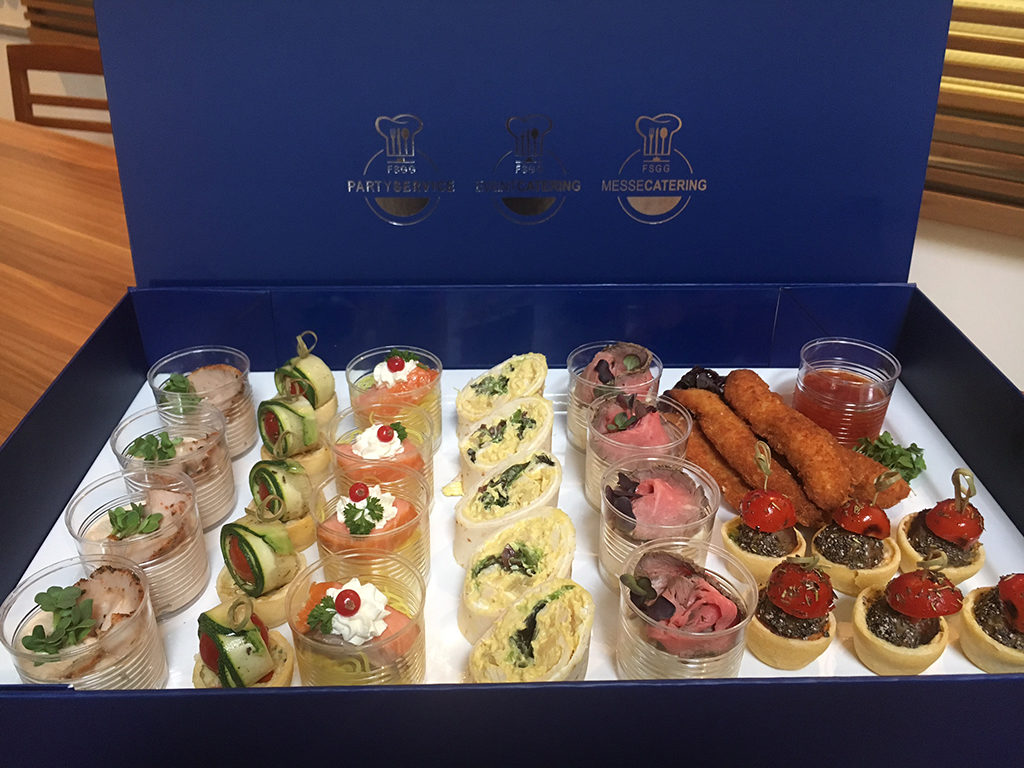 Die FSGG bietet mit der GenussBox ein kulinarisch-kreatives Highlight mit besonderem Service: Ob zarter Lammrücken, Mini-Wraps, Butterfischwürfel in Sesamkruste oder Riesengarnele im Roastbeef-Mantel – die edle GenussBox-Kartonage mit 40-60 Genuss-Happen ist ideal für Messen, kleinere Empfänge oder gar wichtigen Geschäftsbesuch. Zeitig vorbestellt, werden Köstlichkeiten wie edles Fingerfood, feine Canapés sowie traumhafte Desserts kreativ mit der typischen „Großmarktfrische“ des bekannten Duisburger Caterers leidenschaftlich hergestellt und zuverlässig in Kühltransportern bis Köln oder im Ruhrgebiet ausgeliefert.