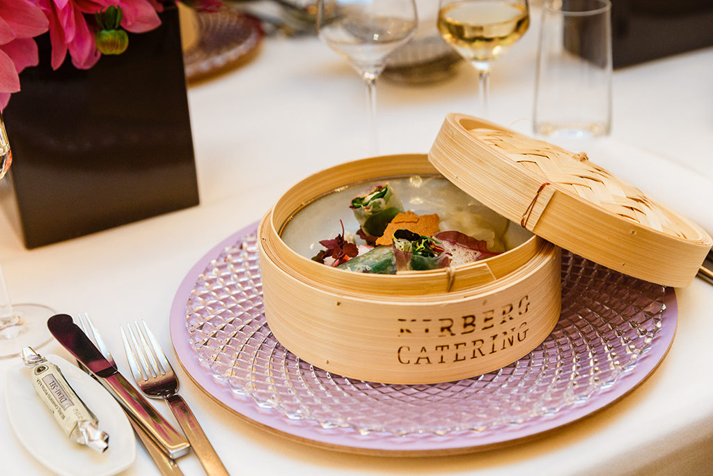 Kirberg Küchenchef Thomas Ottke kreierte mit seinem Team kulinarische Gemälde: Fingerfood – u.a. Purple-Curry-Rotkohlshot mit Lollipop vom Lamm. Die Vorspeise – Confierte Königskrabbe im Reisblatt und Ceviche vom Kabeljau mit Roter Bete, Seewasserperlen und Haselnussschaum. Serviert in der Dim-Sum-Garschale, barockstyle mit Bambus-Deckel, Pardon: Glosche, synchron gelüftet vom Service-Team und zur Freude aller Gäste. Zum Hauptgang: rosa gebratenes Flanksteak mit eingelegtem Pfirsich, Röstmais und schwarzem Bohnenpüree. Das Dessert: antike Holztische, inszeniert als verführerische Sweet Tables mit Petits Fours, Eclairs, Törtchen, Macarons und Cremes auf mehreren Ebenen. Barock interpretiert von Kirberg.