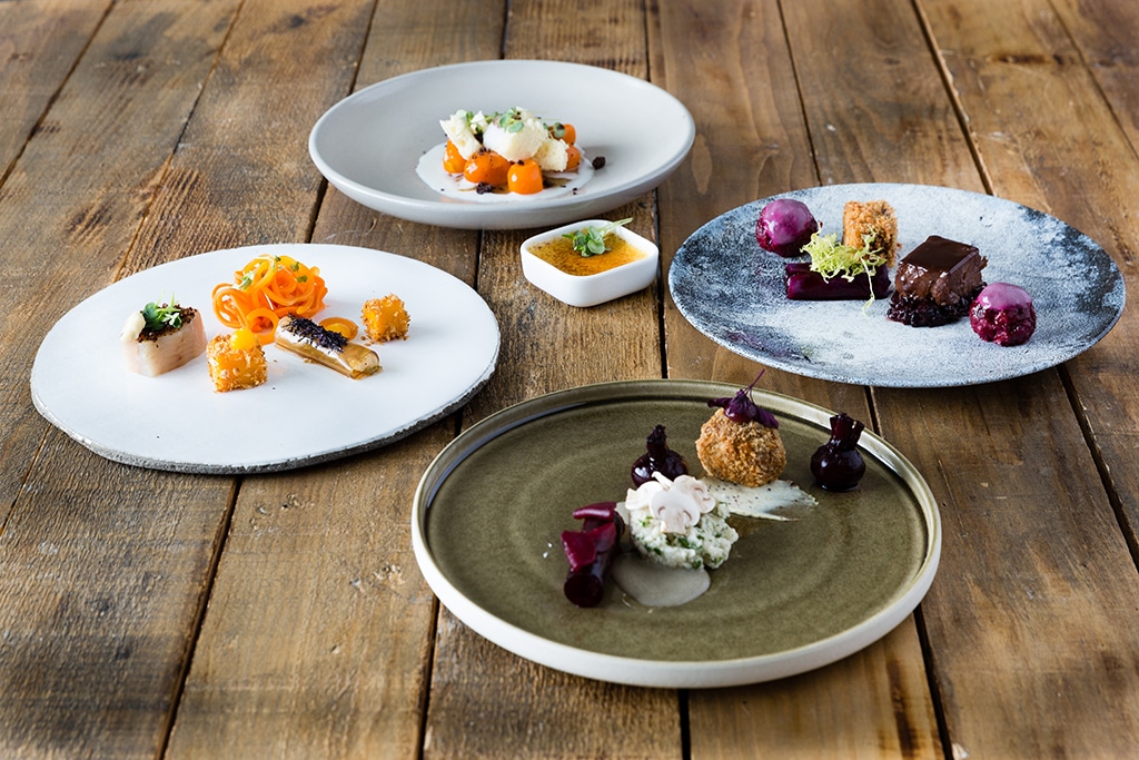 Wildburger von der Havelländer Landente, glasierte Mini Beeten, Karfiol Cous-Cous, Haselnusskaramell und Späne, Salzwiesenchampignons. Saibling gebeizt & Tatar, Kürbis & Karotten- Rohkost & Ponzu, Mandelcreme und Roter Shizo. Komprimierte Gänsekeule & Brust geschmort und gebacken, Apfel- Zwiebelrelish, Rotkohl Hollandaise, Rote Beete Knödel, Weißkraut-Crunch und karamellisierte Maronen. Eingeweckte Bitterorangen, Orangenblüten- Eiscreme und Essenz, Haselnussbisquit, Haselnuss- Creme Bruce. (Bild: Andreas Bohlender | andreasbohlender.de)