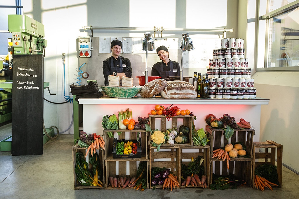 Ein Buffet in Form von essbaren Landschaften, mit einer Auswahl an heimischen Kräutern, knackigen Salaten, regionalem Gemüse, exotischer Kresse und hausgemachtem Dressing aus dem „Springbrunnen“. Dazu wurden frisch zubereitete Croûtons, Baconchips und geröstete Kerne gereicht. Ein Hingucker, da diese essbare Landschaft nicht wie gewohnt in Schalen serviert wurde, sondern wie es untypisch auf einem Buffet zu finden ist, in kleinen Schubkarren und Holztabletts.