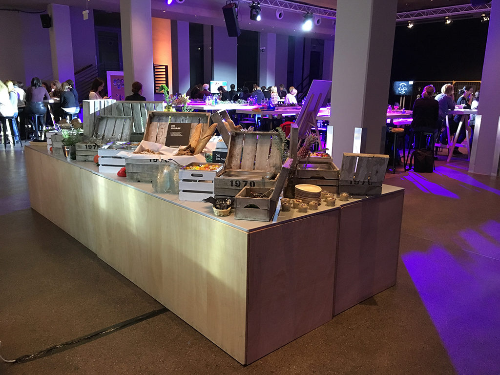 Ein altes Industriegebäude, bunte Spots, loungige Klänge und jede Menge junge, kreative Köpfe. Ob casual oder elegant – unkonventionelle Locations erfreuen sich großer Beliebtheit. Und inmitten des außergewöhnlichen Ambientes sorgt ein kreatives Catering für das kulinarische Highlight der Veranstaltung. Catalogna Cologne Catering nimmt den angesagten Fabrikloftcharme thematisch auf und serviert seine köstlichen Kreationen auf einem hippen Palettenbuffet. Mehrere übereinander gestapelte Europaletten im „Used Look“ sorgen dabei für einen Hingucker der besonderen Art.