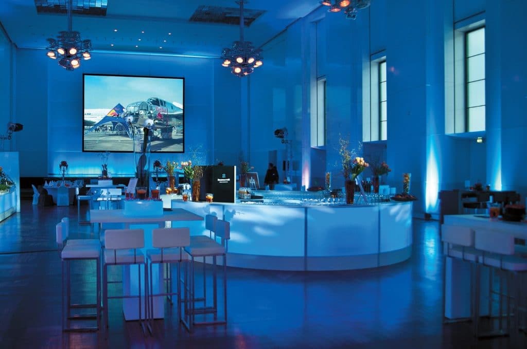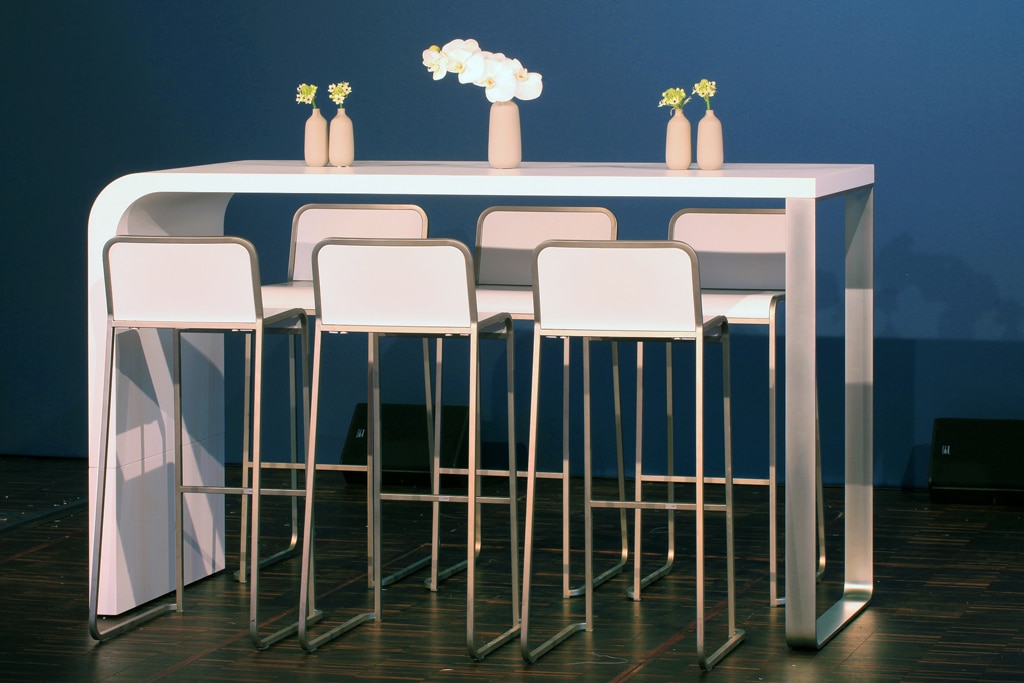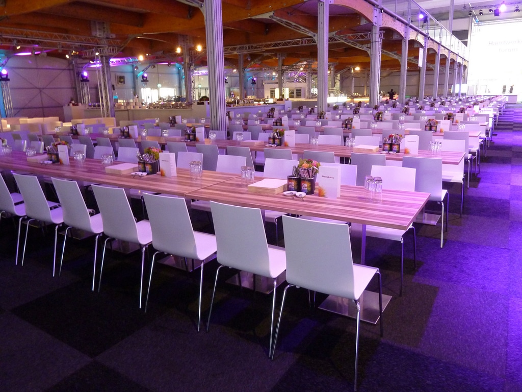 Das perfekte Zusammenspiel der Serien Tiffany und Kuadra spiegelt die Vielfalt des Event- und Messedienstleisters wider. Diese wird durch das Walnuss-Design der Tischserie Tiffany und der dazugehörigen Sitzbank erweitert. Die Kuadra Stühle bestechen durch ihre schlichte Eleganz. Die Höhen- und Größenkombinationen beider Serien passen sich optimal jedem Bedarf an.