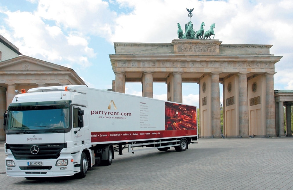 Fuhrpark der Party Rent Group Bereits bei der Investition neuer Lieferfahrzeuge achtet das Unternehmen auf den neuesten Stand der Technik hinsichtlich Verbrauch und CO2-Ausstoß. Aus diesem Grund besteht eine Partnerschaft zwischen der Party Rent Group und einem Top LKW-Hersteller für seine Nutzfahrzeuge. Eine nachhaltige Fahrzeugwartung ist dabei garantiert. 75 % der Fuhrparkflotte der Party Rent Group ist bereits mit bluetec-Technologie ausgestattet. Damit wurde eine Reduktion des Stickoxid-Ausstoßes um 80 % und eine Reduktion des Kraftstoffverbrauchs um 10 % erreicht. Mit einer breit gefächerten Fuhrparkflotte kann das Fahrzeug an die vom Kunden bestellte Warenmenge angepasst werden. Dabei stehen Fahrzeuge – vom Vito, über den Sprinter bis hin zum Sattelgliederzug – auch für eine Kettenanlieferung mit größeren Lieferzeitfenstern zur Verfügung. Eine weitere Investition der Party Rent Group ist die Ausstattung aller Fahrzeuge mit Ladebordwänden. Dies ermöglicht eine Entladung ohne den Einsatz zusätzlicher dieselbetriebener Gabelstapler. Um den kürzesten und wirtschaftlichsten Weg zum Kunden zu finden, ist der gesamte Fuhrpark mit GPS-Ortung und Navigation ausgestattet.