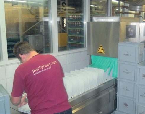 Die Party Rent Group besitzt eigene Spülstraßen mit aktuellster Spül- und Poliertechnik. Das Wasser liefern hochmoderne Osmoseanlagen. Die Warmwasseraufbereitung erfolgt zum großen Teil mittels eigener Solaranlagen. Übrigens: Durch das angewandte HDS-Verfahren (hydromechanisches Drei-Stufen-Verfahren) werden der Spülmitteleinsatz sowie der Wasserverbrauch gesenkt. Derzeit prüft die Zentrale zudem den Einsatz von Regenwasseraufbereitungsanlagen sowie den Einsatz eigener Hauskraftwerke mit Wärmerückgewinnung. Bei der Verpackung ersetzt die Party Rent Group in vielen Bereichen die branchen- übliche Wickelfolie durch maßgeschneiderte, wiederverwendbare Textilhussen zum Schutz. Wenn Wickelfolie trotz allem eingesetzt werden muss, dann vorzugsweise mit einem Stretchautomaten.