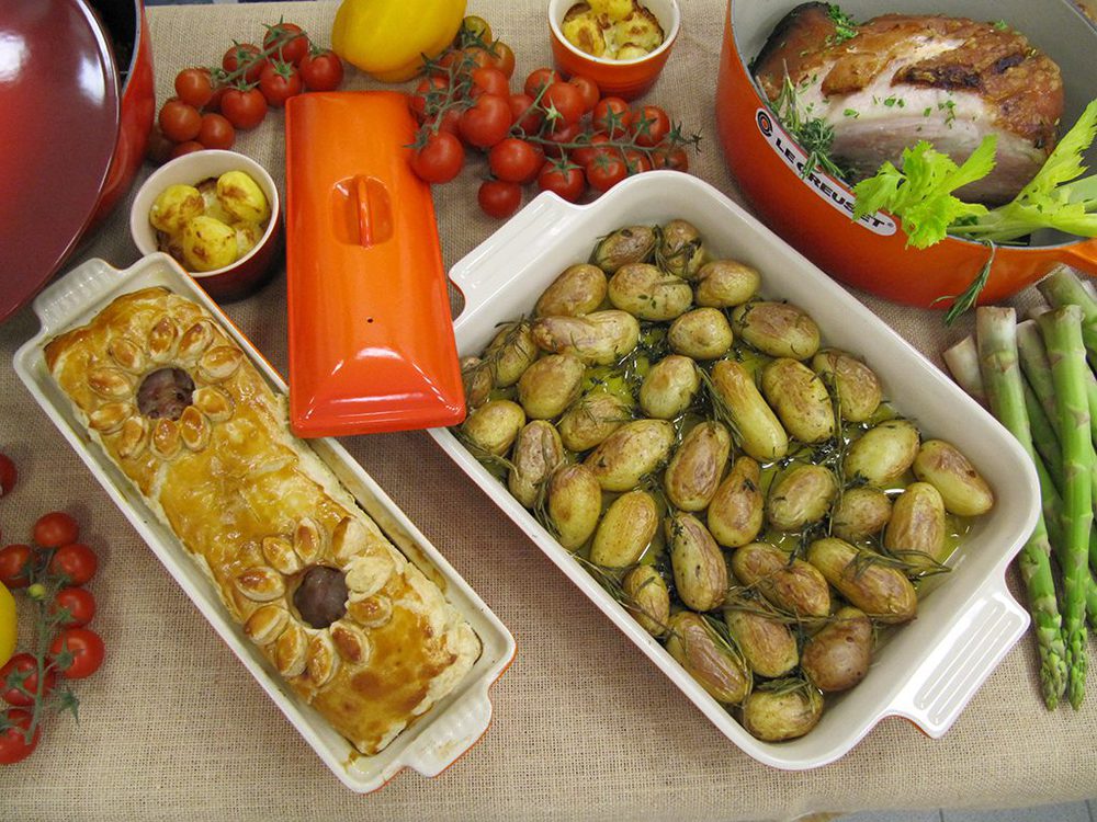 Hoch im Kurs sind die sehr beliebten „Tischbuffets“: Die Speisen stehen in schönen LeCreuset Schalen und Töpfen auf den Tischen und jeder Gast darf „Hand anlegen“ und sich selbst die Speisen seiner Wahl nehmen. Dadurch setzt sofort die Kommunikation am Tisch ein und alle freuen sich, dass die Gäste nicht unruhig aufstehen und am Buffet in der Schlange stehen müssen. Beim Tischbuffet ist die Speisenauswahl sehr umfangreich. Zu Weihnachten gibt es gern kräftige Gänsebrühe mit seinem Fleisch, Gemüse und Peterle; regionale Gänsekeule und -brust in Orangensauce mit Apfelrotkohl und Wirsing in Rahm oder geschmorte Entenkeule und -brust mit Grünkohl, Apfelrotkohl, Kartoffelklößen und gebutterten Salzkartoffeln sowie beschwipste Pflaumen mit Lebkuchencreme.