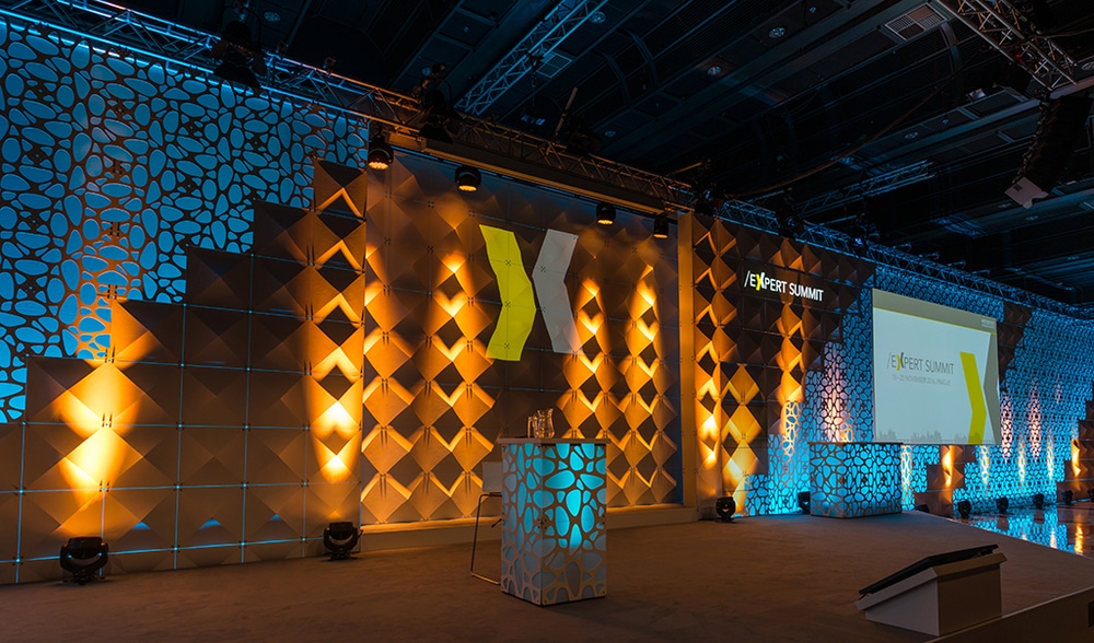 Beeindruckendes Bühnenbild für den Merz Ästhetik Expert Summit 2016 in Prag. Die Panels BLUBBY und PYRAMID umspielten mehrere LED-Wände und wurden durch Projektoren mit dem Logo der Veranstaltung bespielt. Als freistehendes Rednerpult sind die beleuchteten Panels nicht nur dekorativ nutzbar. (Bild: Gahrens + Battermann)