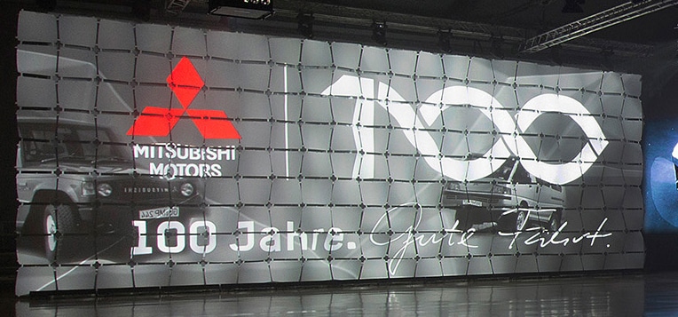 Mitsubishi Händlertag 2017: Projektion auf ein geflogenes Bühnenbild von WAFER Panels mit FROSTY hinterlegt. (Bild: ALEX CHESSA)