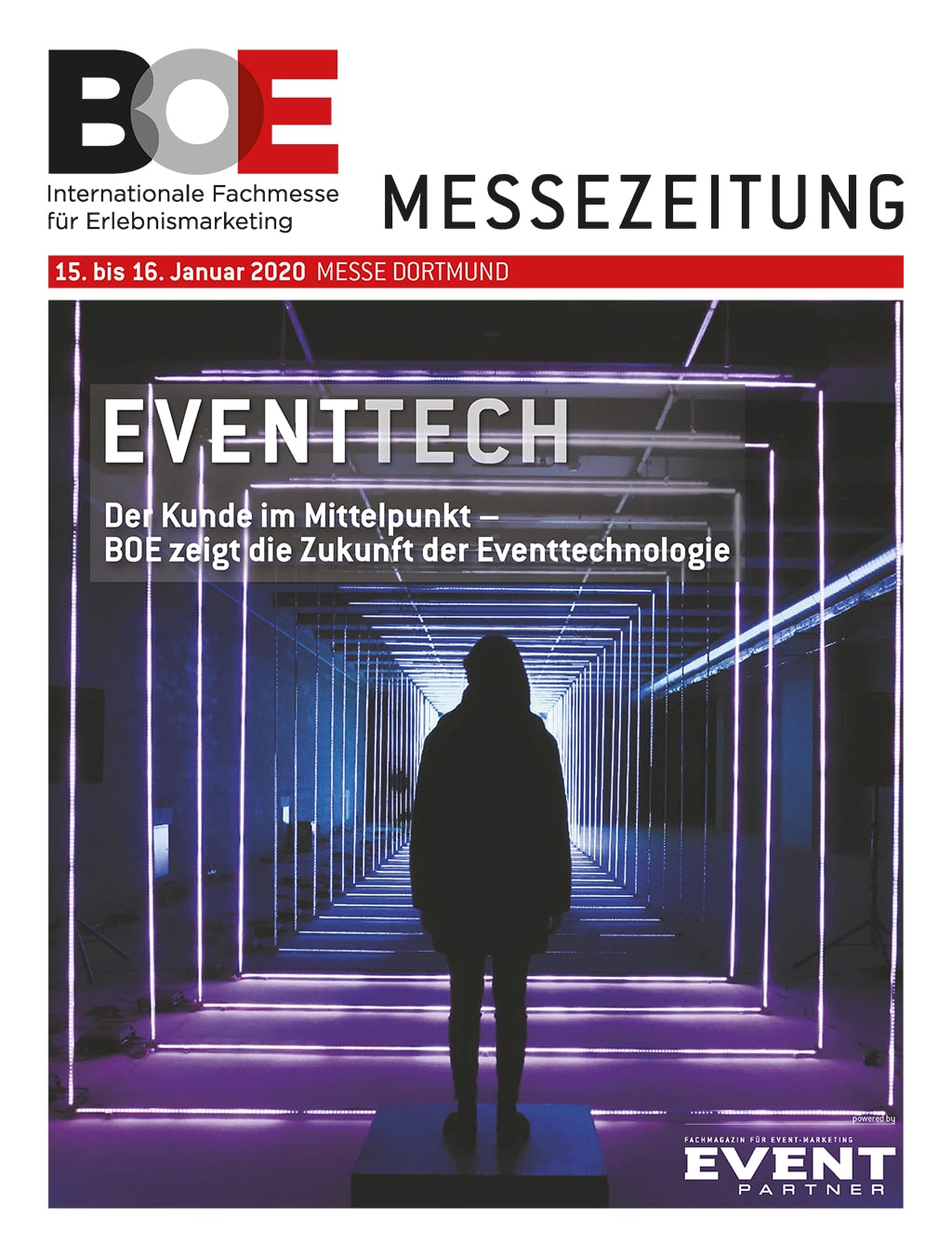 Neben ICT und Interaktion sieht Ostermaier auch das Tracking als wachsenden Bereich und Trend in der Eventtechnik. Welche Eventtech-Trends – von VR, über Self-Service-Technologien bis zu Marketing-Automation im Live-Kontext – die Branche ebenfalls bewegen werden, lesen Sie ab Seite 10 in der BOE Messezeitung. Außerdem wird auf Seite 7 ein Blick auf den International Tech Pavillon geworfen, den die Messe Dortmund 2020 gemeinsam mit Event Tech Lab auf der BOE ausrichten wird – auf dem Programm steht u.a. ein Start-up-Wettbewerb für Tech-Unternehmen.