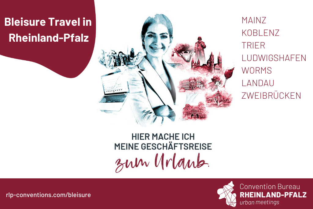 Ganz einfach: „Bleisure“ setzt sich aus den Begriffen „Business“ (Geschäft) und „Leisure“ (Freizeit) zusammen. Dahinter steckt also eine Geschäftsreise, die mit einem anschließenden oder vorgelagerten Privataufenthalt kombiniert wird. Es ist die perfekte Möglichkeit, Arbeit und Freizeit zu verbinden und neue Orte zu entdecken. Die rheinland-pfälzischen „Bleisure-Städte“ Mainz, Koblenz, Trier, Ludwigshafen, Worms, Landau und Zweibrücken bieten genau das. Eingebettet in die malerische Topografie von Rheinland-Pfalz mit seinen Weinbergen, Tälern, Wäldern und Flusslandschaften, verbinden sie den Charme kaiserlicher Geschichte mit herzlicher Gastlichkeit. Mit der besonderen Atmosphäre der lebendigen Innenstädte, einer erholsamen Auszeit in der Natur und weltberühmten Weingütern hat Rheinland-Pfalz vor bzw. nach einer Tagung oder einem Kongress viel zu bieten.