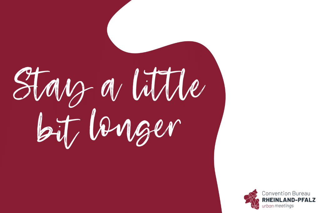Mit dem neuen Angebot „Stay a little bit longer…“ erhalten Geschäftsreisende einen Rabatt von 20 % auf den verlängerten Aufenthalt. Geschäftsreisende buchen den verlängerten Aufenthalt einfach direkt bei den teilnehmenden Partnerhotels. Lassen Sie sich von den Bleisure-Highlight-Angeboten inspirieren und krönen Sie Ihren Aufenthalt mit einem Kultur-, Genuss- und/oder Naturerlebnis in Rheinland-Pfalz.