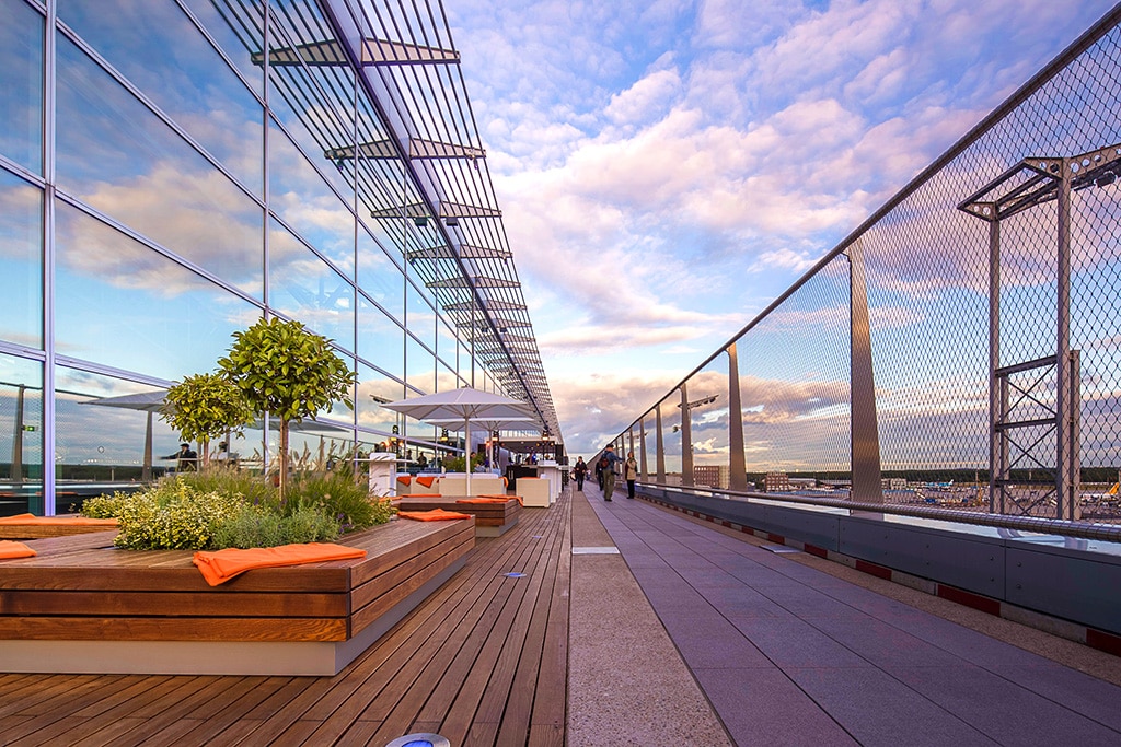 … im Terminal 2 ist der ideale Standort für Events vor spektakulärer Kulisse. Auf einer Fläche von 1.800 m2 lassen sich große und kleine Veranstaltungen mit bis zu 800 Personen durchführen. Die faszinierende Aussicht auf das Vorfeld des Flughafens Frankfurt wird Ihre Gäste beeindrucken und sorgt für absolutes Weltenbummler-Flair. Durch das integrierte Beleuchtungssystem werden das moderne Design der Terrasse unterstrichen und individuelle Gestaltungsmöglichkeiten geschaffen. Ob Get-together, Corporate Event oder After-Work-Party – lassen Sie Ihrer Kreativität freien Lauf.