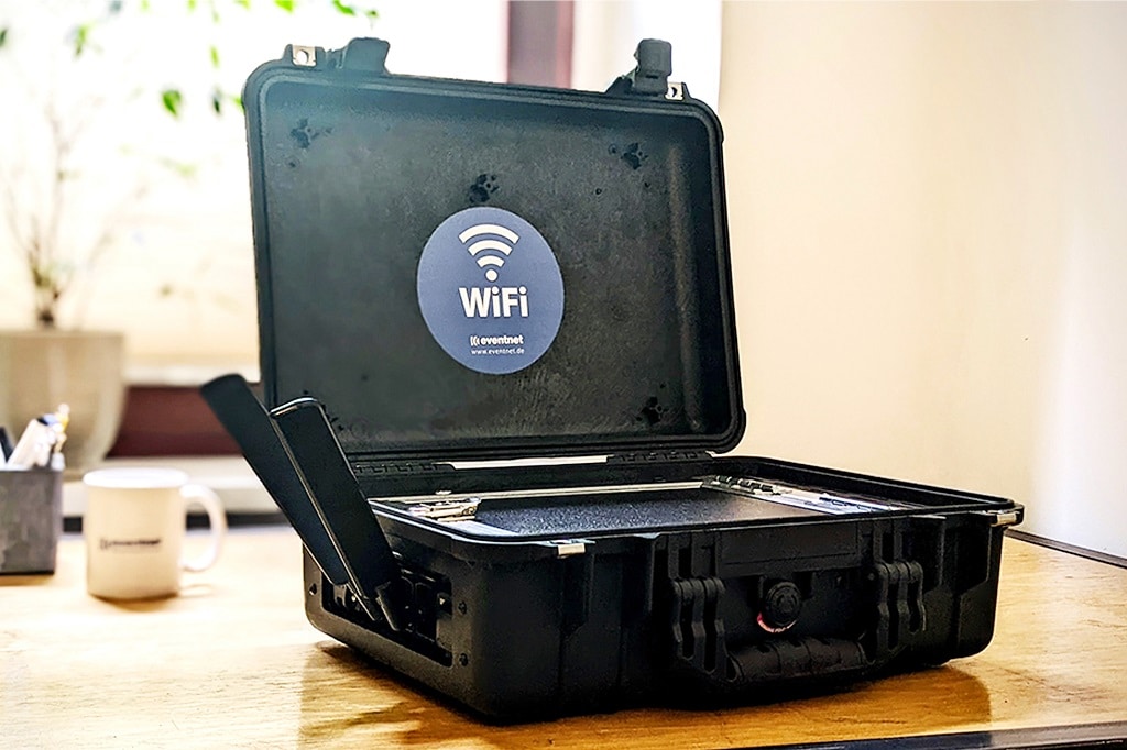 Der „Hotspot in a Box“ ist eine kompakte Lösung, die in Regionen mit LTE- oder 5G-Abdeckung eine zuverlässige WLAN-Versorgung bietet. Sie eignet sich besonders für kleinere Veranstaltungen im urbanen Raum, bei denen eine stabile Internetverbindung für bis zu 50 Geräte benötigt wird.