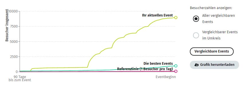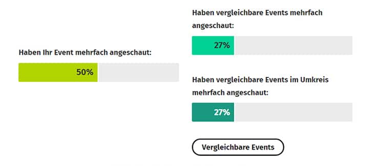 In der Gegenüberstellung mit ähnlichen Events auf dem XING Eventmarkt sehen Veranstalter, wie erfolgreich ihre Eventseite in Abgrenzung zum Wettbewerb ist – optional im Umkreis von 20 Kilometern.