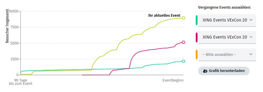 Veranstalter wählen in dieser Darstellung bis zu drei ihrer vergangenen Events aus, mit denen sie ihr aktuelles Event vergleichen möchten. So stellen sie sicher, dass sie ihre Ziele erreichen.