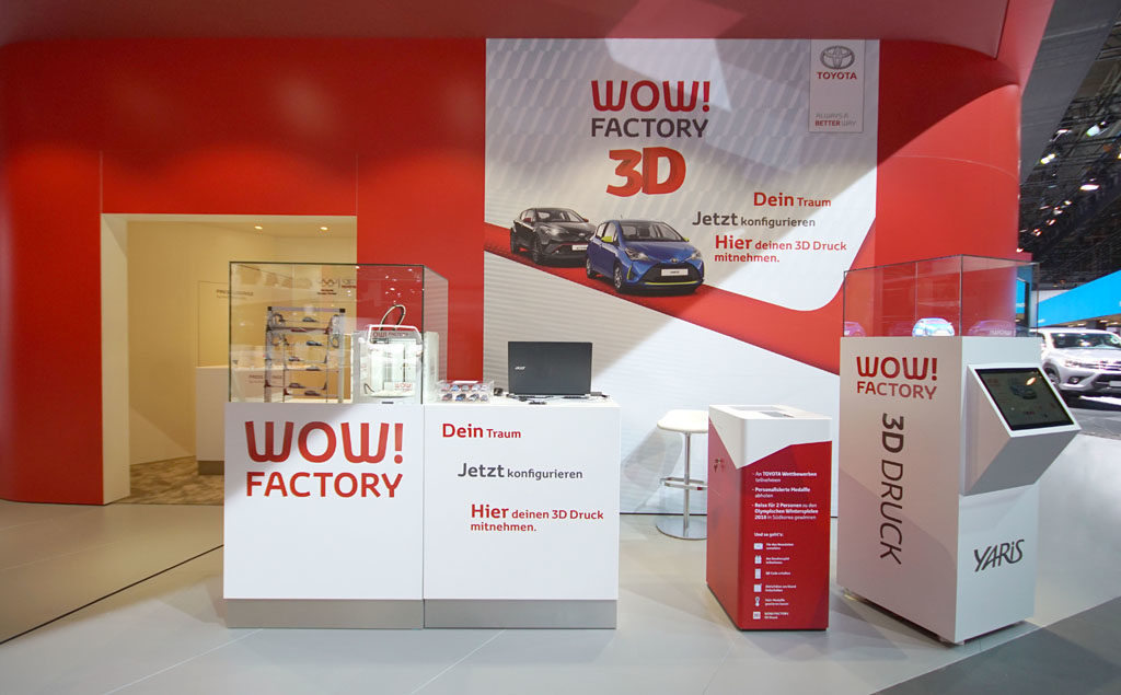 Besucher auf dem Toyota-Stand konnten sich auf diese Weise ihren ganz persönlichen Toyota im 3D Live-Konfigurator der mappingBOX gestalten und direkt maßstabsgetreu als vollfarbigen 3D-Druck mitnehmen. Eine solche Kombination hat es in der Kundenwelt bislang noch nicht gegeben und verdeutlicht den Weg des Herstellers, den Kundenwunsch stets in den Mittelpunkt aller Aktivitäten zu rücken.