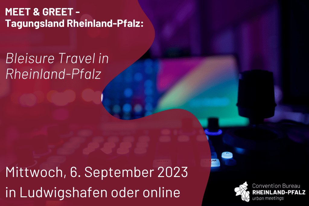 Das hybride Event „MEET & GREET – Tagungsland Rheinland-Pfalz“, das vom Convention Bureau Rheinland-Pfalz (CB RLP) entwickelt und im vergangenen Jahr erstmals durchgeführt wurde, geht am 6. September 2023 in Ludwigshafen in die nächste Runde. Hierzu stellt der dortige Partner LUKOM Ludwigshafener Kongress- und Marketing-Gesellschaft mbH seine Räumlichkeiten im Pfalzbau zur Verfügung. Das Event richtet sich an Kunden, Eventplanende, Locationbetreiber und Geschäftsreisende und lädt in der Neuauflage zum Thema „Bleisure Travel in Rheinland-Pfalz“, die Verbindung von Geschäftsreise und privatem Aufenthalt, ein.