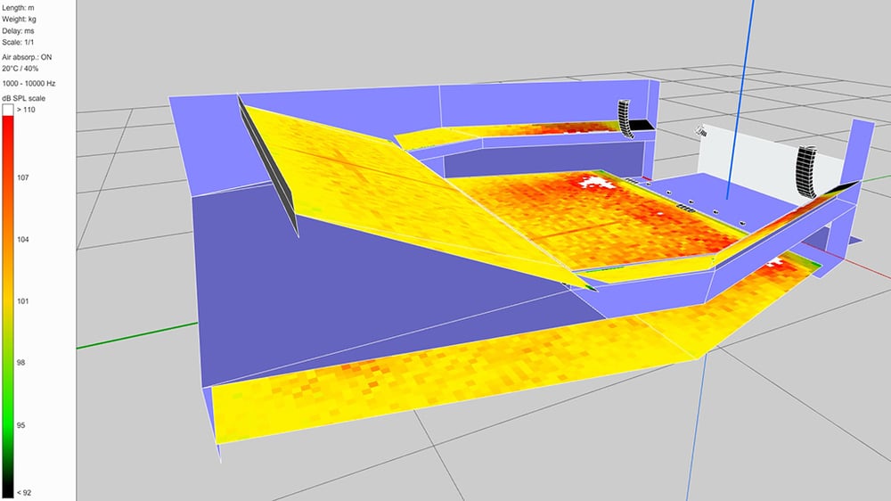 In der Hall werden links und rechts je ein Array mit 13 K2 Lautsprechern zum Einsatz kommen. Die Anzahl und Position der Lautsprecher hängt von der jeweiligen Raumkonfiguration ab; sie werden u. a. vom neusten AMP LA12X betrieben. Die Main Hangs werden mit einem Abstand von 25 Metern und in einer Höhe von zehn Metern über Boden an der Vorderseite der Bühne positioniert. Dies macht den Einsatz eines Center Clusters mit 4 × KARA nötig, um eine vollflächige Abdeckung gewährleisten zu können. Für den gewünschten Schub sorgen zwölf KS28 Subs. Das ganze Sounddesign ist darauf ausgelegt, den gesamten Raum ausschließlich über die beiden Main Hangs zu beschallen. Lediglich dort, wo die Physik auch mit noch so viel brachialer Power nicht zu überwinden war (unter dem Balkon und direkt vor der Bühne), wird ein Delay respektive ein Nearfill mit je fünf X8 installiert.