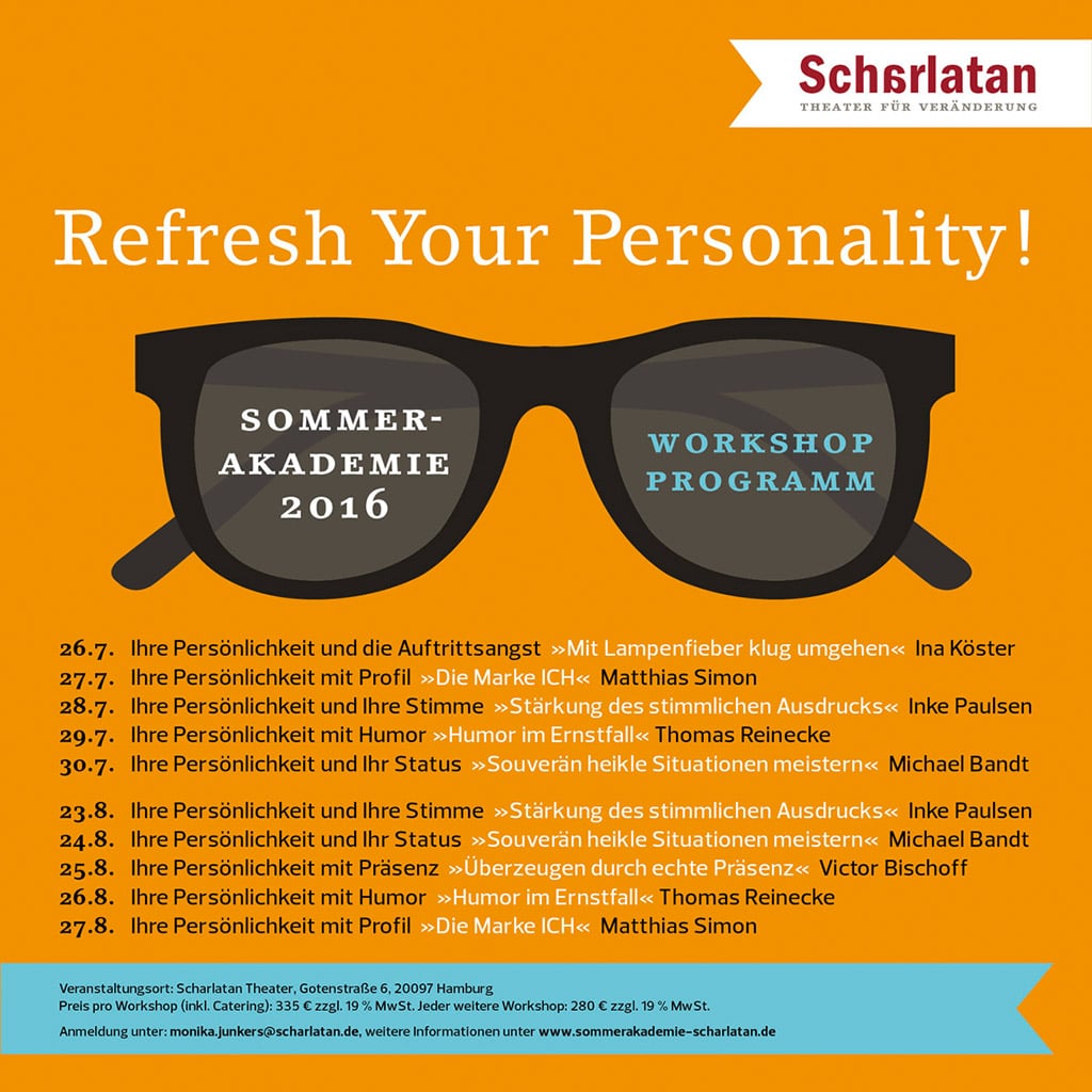 Wer seine Persönlichkeit auffrischen und weiterentwickeln möchte, ist bei der diesjährigen Sommerakademie im Scharlatan Theater für Veränderung genau richtig. Unter dem Motto „Erfrischung für Ihre Persönlichkeit“ finden vom 26.7. bis zum 27.8.2016 in Hamburg zahlreiche Tagesworkshops zu vielfältigen Themen der Persönlichkeitsentwicklung statt.