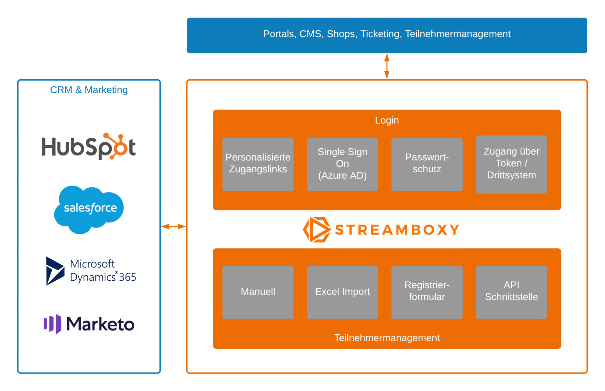 Ob im Self-Service oder im Full-Service, unterstützt durch das Streamboxy-Netzwerk bei der Produktion und Gestaltung: wie das Event geplant und umgesetzt wird, entscheidet der Kunde. Ebenso, ob externe Systeme und Anwendungen eingebunden werden: von CRM-Systemen bis zum Nutzen der API-Schnittstelle für das Bereitstellen von Daten zum Teilnehmermanagement und die Auswertung der Teilnehmerinteraktion.
