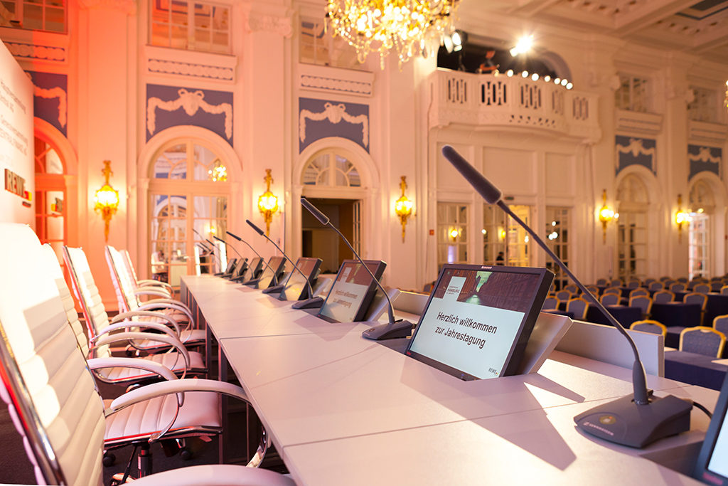 Damit eröffnet sich vor Ort in technischer Hinsicht einiger Spielraum zur Gestaltung, womit es keine bestimmten Locations gibt, die per se als Tagungsort einer HV ausfallen. Die Veranstaltungstechnik kann damit den jeweiligen Gegebenheiten vor Ort gut angepasst werden. Dort müsse im Prinzip nichts fest installiert sein, stellt Stefan Hartmann fest: „Alles kann vom Dienstleister eingebracht werden. Es gibt allerdings ein paar Punkte, die gewährleistet sein müssen. Um die Tonübertragung der Versammlung im gesamten Präsenzbereich sicherzustellen, müssen Toiletten, Aufenthaltsräume und Umgänge (Foyer, Treppen) beschallt werden können und es ist von Vorteil, bereichsweise auf eine fest installierte Anlage zurückgreifen zu können. Ein Netzwerk zur Signalverteilung ist darüber hinaus wünschenswert, allerdings auch nicht zwingend notwendig. Redundanz ist für die Sicherstellung der Übertragung sinnvoll, aber nicht vorgeschrieben, solange die bereits erwähnten Punkte garantiert werden können. Es ist natürlich im Interesse des Veranstalters, dass die Tonübertragung in jedem Falle gewährleistet wird, um keine Unterbrechung der HV oder gar einen Abbruch zu riskieren. Zu guter Letzt sollten alle sicherheitsrelevanten Aspekte einer Veranstaltung wie Entfluchtungskonzept oder Notbeleuchtung gegeben sein, das gehört aber bei öffentlichen Veranstaltungshallen ohnehin zum Standard.“