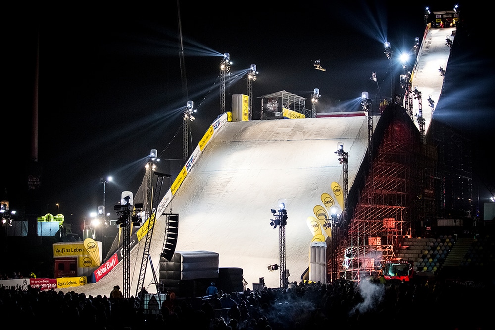 120 Ski- und Snowboard-Freestyle-Athleten aus 20 Nationen standen am ersten Dezemberwochenende beim ersten Big-Air-Doppelweltcup Europas, organisiert von Allrounder, am Start. Wo? Im Mönchengladbacher Sparkassenpark. Genauer gesagt, in einer Höhe von 49 Metern und damit auf der größten Big-Air-Rampe der FIS – gebaut von dem Spezialisten für Eventbauten Nüssli.