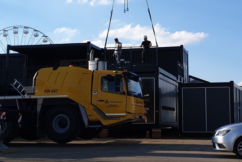 Der Transport zur und von der Location erfolgt dann mittels LKW, die über die notwendigen Twistlock-Aufnahmen und je nach gewähltem Dienstleister auch über einen Ladekran verfügen. Abhängig von der Komplexität der gedachten Event-Containeranlage reicht jedoch ein LKW-Ladekran mitunter nicht mehr aus und es muss zusätzlich ein Autokran für das Handling bestellt (und bezahlt) werden. Ein weiterer Grund für den Einsatz eines Autokrans besteht oft darin, dass die Anlieferung mittels gewöhnlicher Speditionen erfolgen kann, die üblicherweise nicht über LKW mit Ladekran verfügen. Dazu kommt, dass der Aufbau einer komplexen Anlage selbstverständlich nicht irgendeinem Fahrer bzw. irgendeiner Fahrerin überlassen werden sollte.