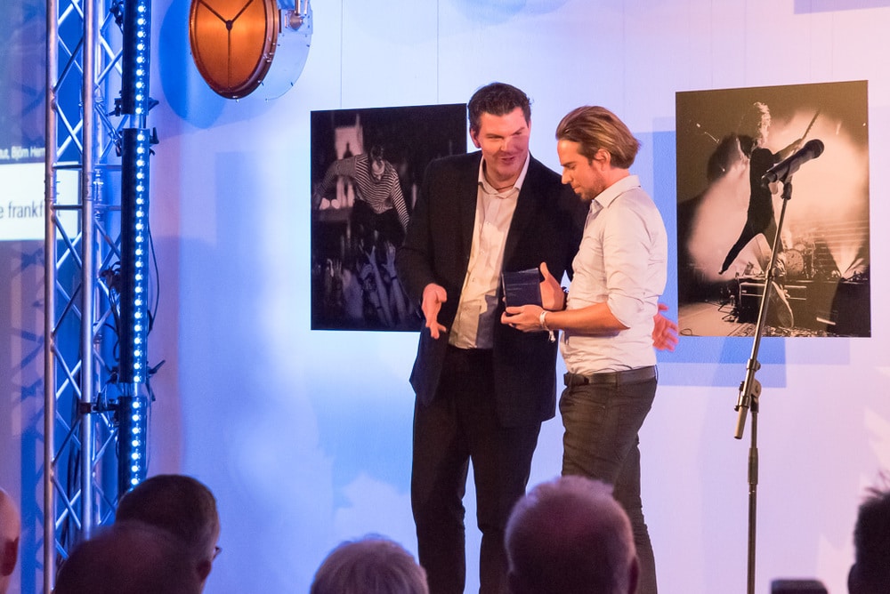 Björn Hermann (r.) erhält den Opus – Deutscher Bühnenpreis 2016, überreicht von Michael Biwer, Director Prolight + Sound (Bild: Detlef Hoepfner)