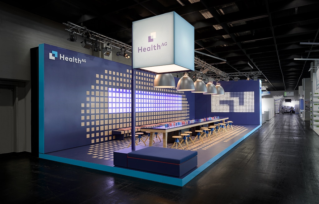 Die Idee war dann entsprechend, einen Raum zu konzipieren, der „das miteinander reden“ und das „zusammen etwas entwickeln“ zentral widerspiegelt. Deshalb haben wir der Familie der „Healthies“ – den Mitarbeitern und Kunden – ihren eigenen 9-Meter-langen „Küchentisch“ gegeben und ihn in die Mitte des Messestandes gestellt – wie ja auch zuhause der Küchentisch das kommunikative Herz der Wohnung ist.