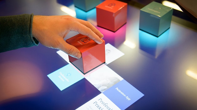 Die Besucher konnten den Tisch über eine multitouchfähige Oberfläche und mit Hilfe von „Tangible Objects“ – unseren Health-Würfeln – erkunden. Jeder Würfel symbolisierte einen Themenbereich. Bei Aktivierung – sprich: Wenn der Würfel vom User aufgelegt wurde, wickelte sich der Inhalt digital ab und enthüllte weitere Kapitel.
