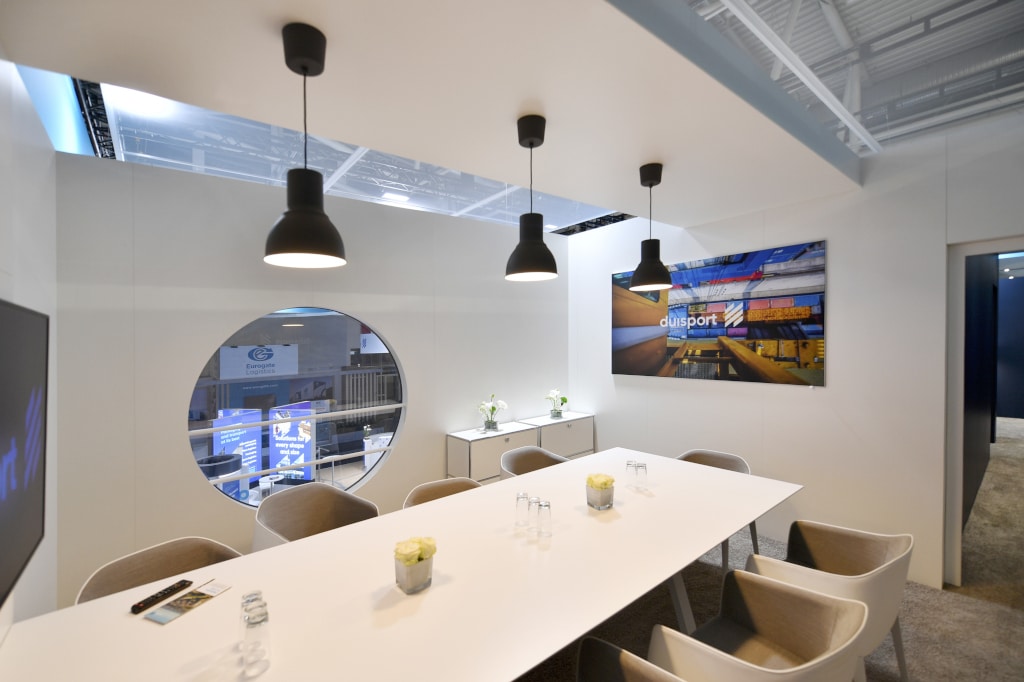 Gleich der nächste Blick zeigte die Unternehmensstruktur. Kreise, durch Linien verbunden, erstreckten sich als Boden- und Deckenelemente über den gesamten Bereich und symbolisierten die Verbindungen von duisport als Ganzes, sowie die ihrer Tochtergesellschaften und Partner mit ihren vernetzten Leistungsspektren. Durch die dreidimensionale Visualisierung prägten sich den Besuchenden die Vorteile des Full-Service-Providers in einem soliden Netzwerk als „Gateway to Europe“ ein. Ein System, das laut Amecko nicht nur symbolisch zeigte, wie leistungsfähig es sei.