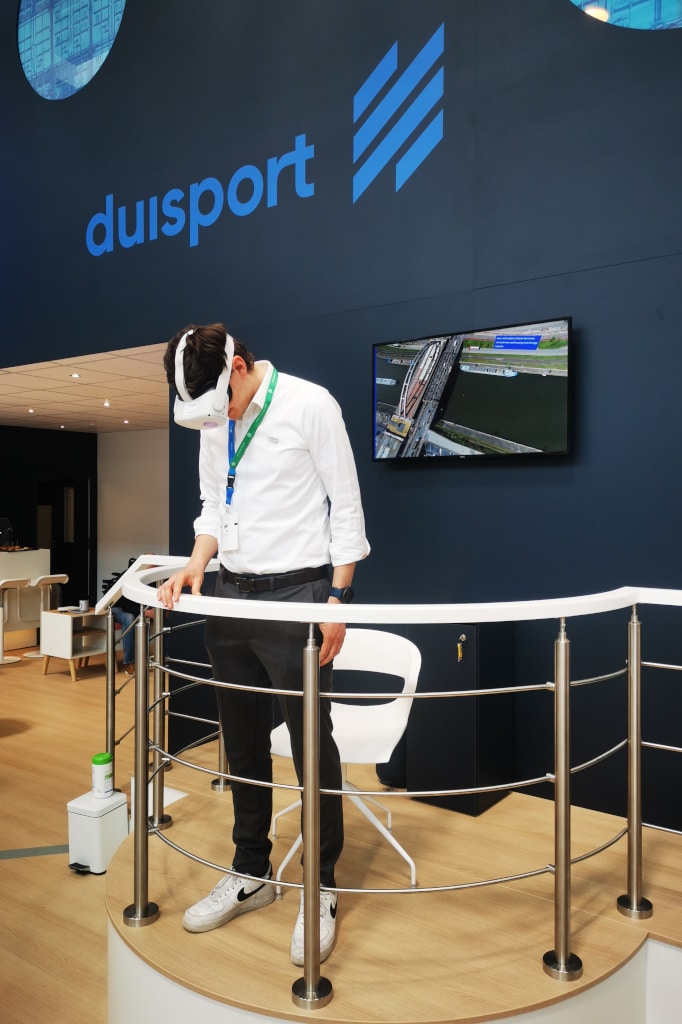 Zu den Highlights des Messestands zählte auch eine Virtual-Reality-Tour durch den größten Binnenhafen der Welt. Um den Besuchenden die Arbeit von duisport nicht nur rein informell erfahrbar, sondern vor allem auch lebendig zu machen, schoss Amecko repräsentative 360°-Fotos vom Binnenhafen. Duisport steuerte zudem 360°-Drohnenaufnahmen bei, so dass sich die Betrachtenden in kurzer Zeit einen vollständigen Eindruck über den Hafen verschaffen konnten, ganz ohne Reisezeit! Zudem brauchte es dafür lediglich je zwei m² Platz für die VR-Stationen mit Vorschauscreen und einem Drehstuhl für die Besuchenden.