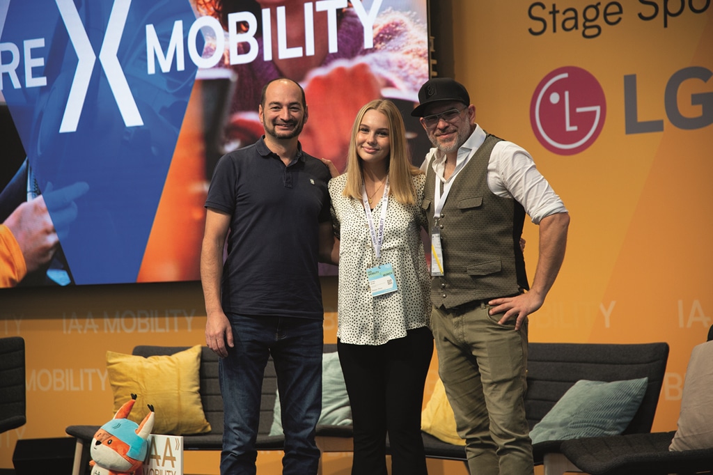 Teamleiter Pasquale Zuppa (l.) und Projektleiter Axel Dennhardt (r.) von N&M zusammen mit EVENT PARTNER Redakteurin Vivien Grott auf der IAA Mobility (Bild: Wiebke Heyder)