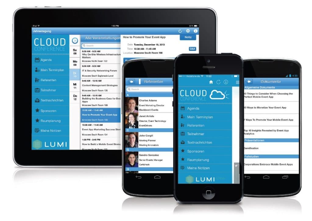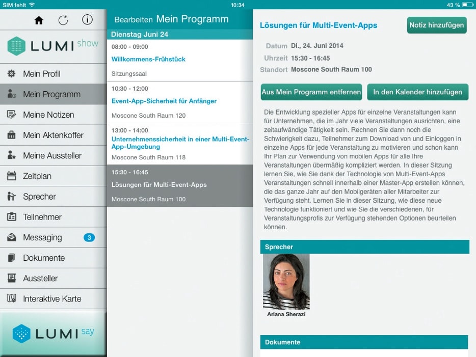 Aus Veranstaltersicht ist die mobile Event App Lumi Show eine Rundum-Lösung, die das Zeug hat, gedruckte Veranstaltungsinformationen abzulösen. In der App kann das Veranstaltungsprogramm mit Zeitplan, Sprecherliste, Präsentationen und weiterführenden Dokumenten abgebildet werden. Gibt es Aussteller auf dem Event, kann man sich diese ebenfalls in einer Liste bzw. einer interaktiven Karte anzeigen lassen oder mit einer Stichwortsuche nach ihnen recherchieren. So bekommt man als Besucher bereits vor der Veranstaltung einen Überblick, welche Programmpunkte oder Kontakte interessant sein könnten.