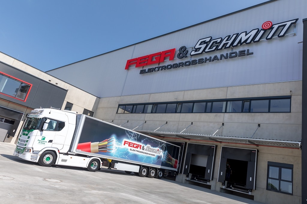 Beeindruckende Zahlen: 250.000 Kubikmeter umbauter Lagerraum, 40.000 m2 Grundstücksfläche und 10.000 Palettenstellplätze kennzeichnen das am 7. Juni 2019 mit einem Festakt eingeweihte Logistikzentrum des Elektrogroßhändlers FEGA & Schmitt. Zur Eröffnungsfeier fanden sich ab 13 Uhr rund 500 Gäste auf einer zur Eventlocation umgestalteten Lagerfläche im dritten Obergeschoss des Neubaus ein.