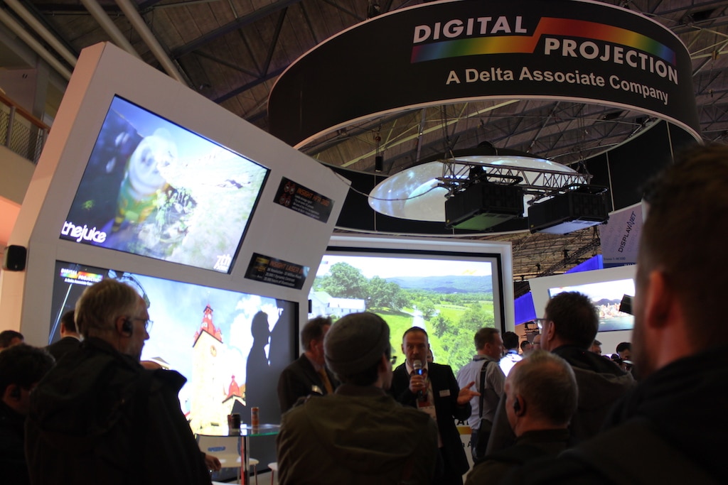 Showstopper beim letzten Messestand der Tour, Panasonic, war – neben dem neuen 50.000 Lumen Laserprojektor in einem kompakten Gehäuse, der Ende des Jahres erscheint – eine aufblasbare Halbkugel, in welche mit mehreren Fischaugen-Objektiven projiziert wurde, zwei Tänzer mit dem Content interagierten und die Besucher so auf eine visuelle Reise um die Welt mitnahmen.