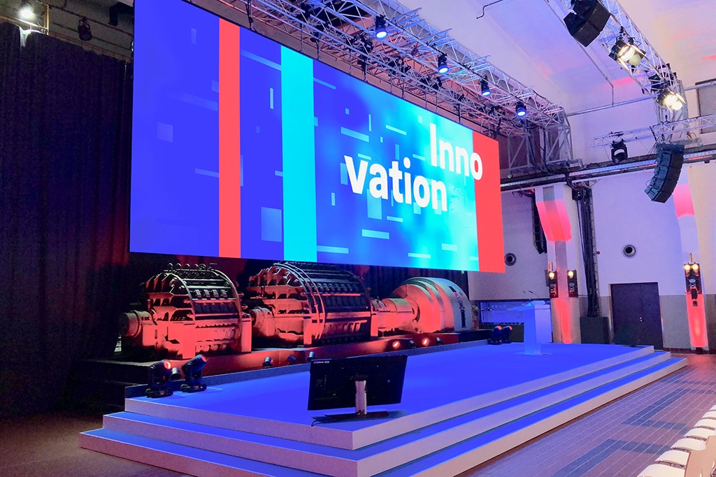 Bühnenaufbau für ein Online-Event in der Streaming Area der Grand Hall Zollverein (Bild: LK AG)