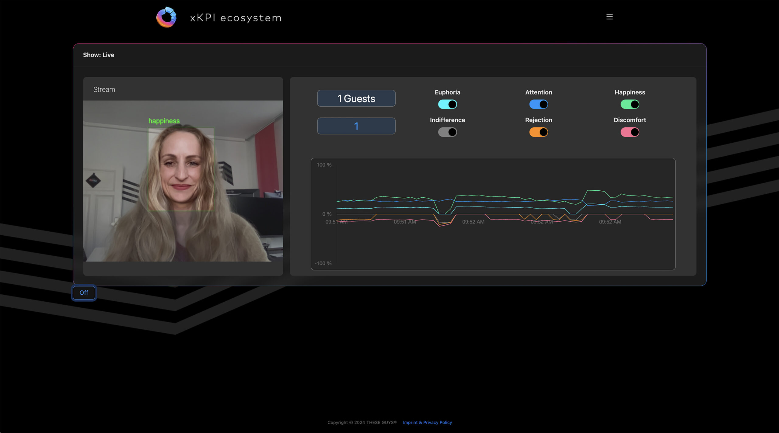 Obwohl xKPI in vollem Umfang auf Kameratechnik angewiesen ist, soll dasSystem keine Gesichtsdaten sichern. „Es werden nur die Emotionsdaten in aggregierter, anonymisierter Form gespeichert. Wir haben dann auch keine einzelnen Daten und können sie zum Beispiel nicht der Person in der dritten Reihe links zuordnen,“ so Karin Schneider. Die KI erstellt also viel mehr eine Landkarte der Emotionen im Gesicht und speichert diese zusammengefasst ab – ohne, dass das zugehörige Gesicht als solches gespeichert wird. Eventteilnehmende brauchen also keine Angst davor haben, dass sie personalisiert analysiert werden und ein Nutzerprofil angelegt wird.