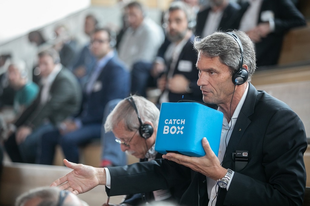 Ein Gast spricht in die „Catchbox“, die für Fragen ins Publikum geworfen wird und mit Mikrofon und Funksender ausgestattet ist. (Bild: bwcon / Uli Regenscheit)