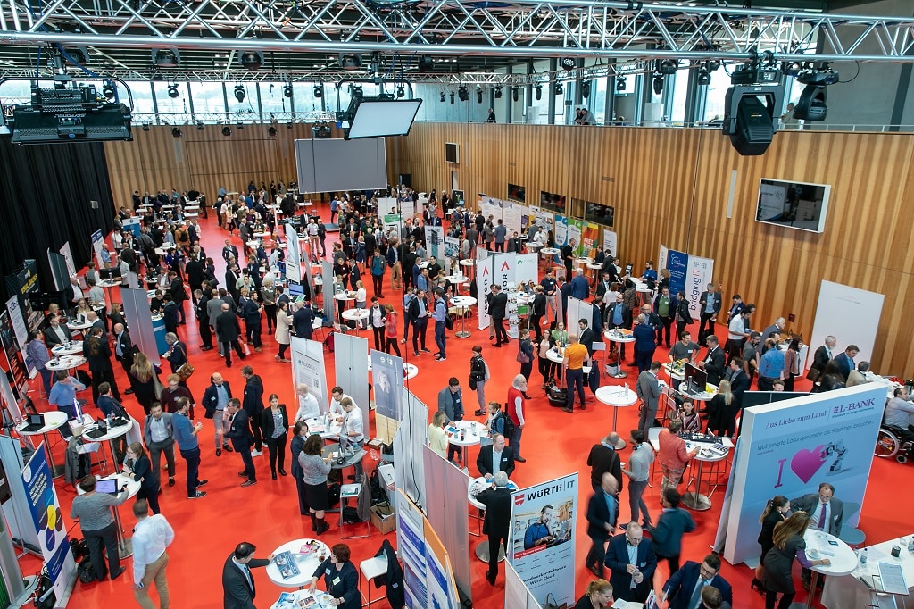 Drei der vier Forenbereiche, in denen parallel „stille“ Konferenzen stattfinden. Die Teilnehmer wählen dazu den Übertra-gungskanal der jeweiligen Konferenz aus. (Bild: bwcon / Uli Regenscheit)