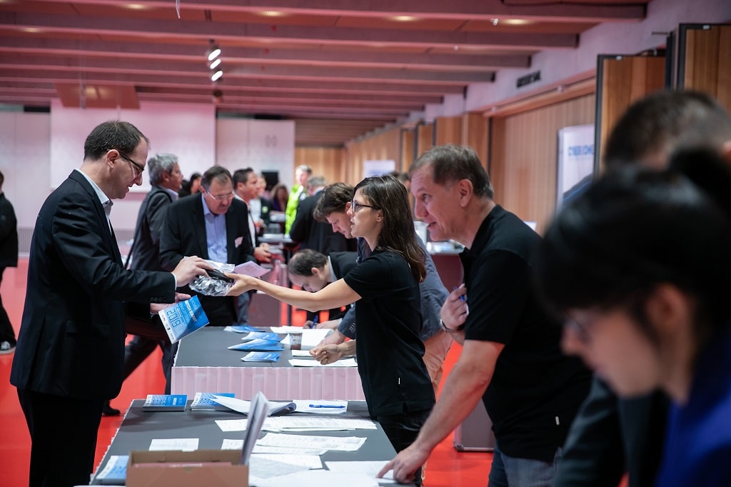 Silent-Conference-Technik: Ausgabe der Kopfhörer und Infrarot-Empfänger an einen der insgesamt 1.000 Teilnehmer (Bild: bwcon / Uli Regenscheit)
