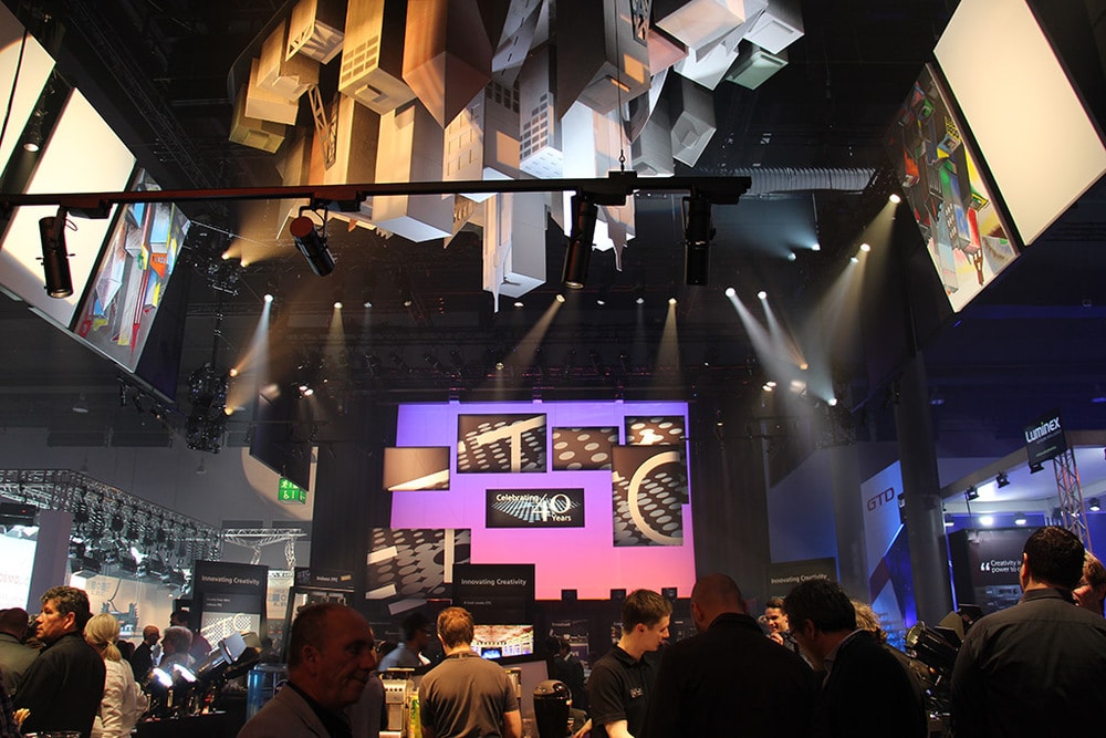Der Messestand von ETC wartet auf der Prolight + Sound mit einem kreativen Deckengebilde auf. (Bild: Sylvia Koch )