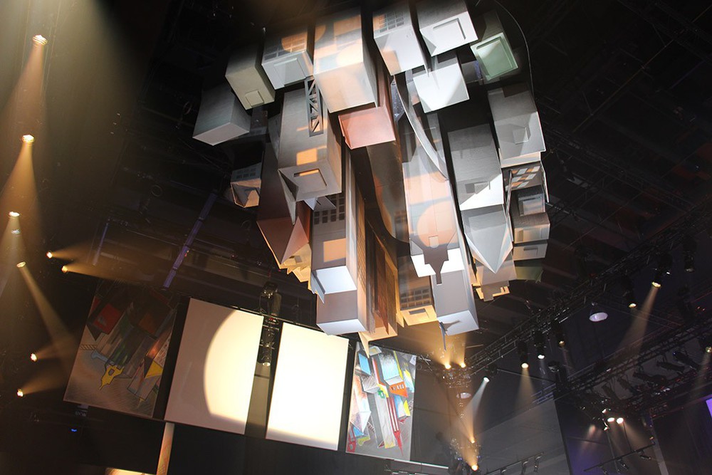 Das Stadtmodell an der Decke veranschaulicht den Besuchern von ETC den Blickwinkel eines Veranstaltungstechnikers, der hinter der Bühne auf das Geschehen hinabsieht. (Bild: Sylvia Koch )