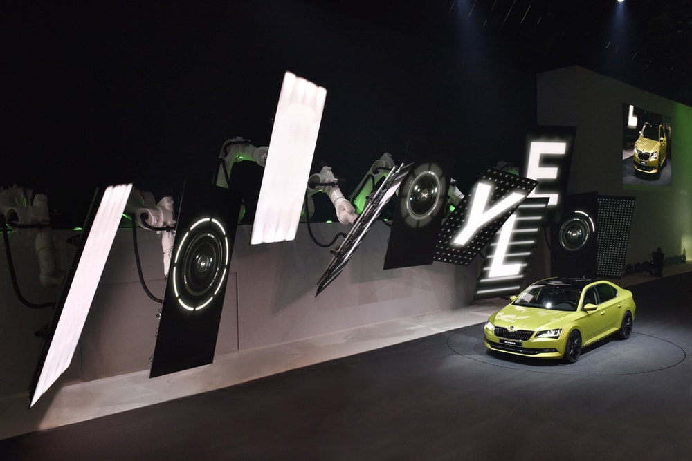 Ähnliche Erfahrungen haben Stephan Overkott, Mitglied der Geschäftsleitung der Dortmunder Agentur Xpion, und Jörg Wienforth, Head of Creation bei United Visions, gemacht. Gemeinsam mit IBG Automation haben sie im Herbst 2015 die Volkswagen Group Night in Genf entwickelt und realisiert. Hauptdarsteller: Zehn Roboter, ebenfalls von Kuka, aber deutlich größer und schwerer als der fragile „Rob“. Sie bewegen in einer beeindruckenden Choreografie große Screens, setzen sich zu Flächen zusammen, trennen sie wieder, scheinen Fahrzeuge mit ihren Blicken zu verfolgen. Und immer ist die Bewegung der Roboter genau abgestimmt auf die Bespielung der Screens.