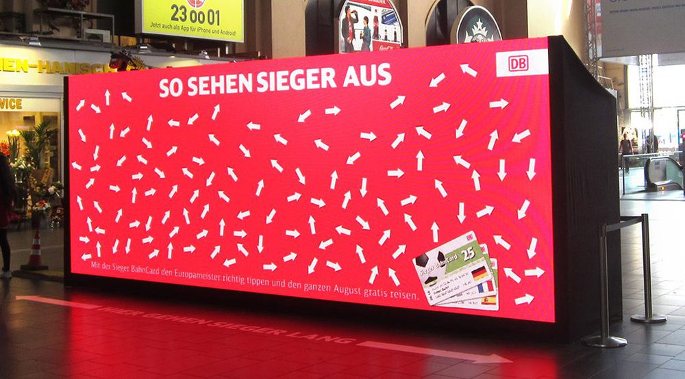Die „Sieger BahnCard“ der Deutschen Bahn wurde über viele Kanäle kommuniziert. Selbstverständlich durfte da ein Event nicht fehlen, um die Promotion-Aktion auch live erlebbar zu machen. Daher sollte am Berliner und Frankfurter Hauptbahnhof eine riesige LED-Wand mit der Möglichkeit zur Interaktion aufgestellt werden. Ein schöner Auftrag für Sinus Event-Technik aus Darmstadt und auch eine kleine Herausforderung. Denn auf der LED-Wand sollten verstreute Pfeile zu sehen sein, die sich, sobald ein Passant vor der Wand vorbeilief, auf diese Person fokussieren und mit ihr „mitlaufen“ würden. Eine möglichst flache LED-Wand mitten in den Raum zu stellen, das ist eine Sache. Eine ganz andere, den gewünschten Content auf der Wand umzusetzen!