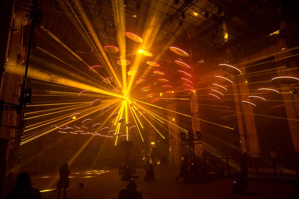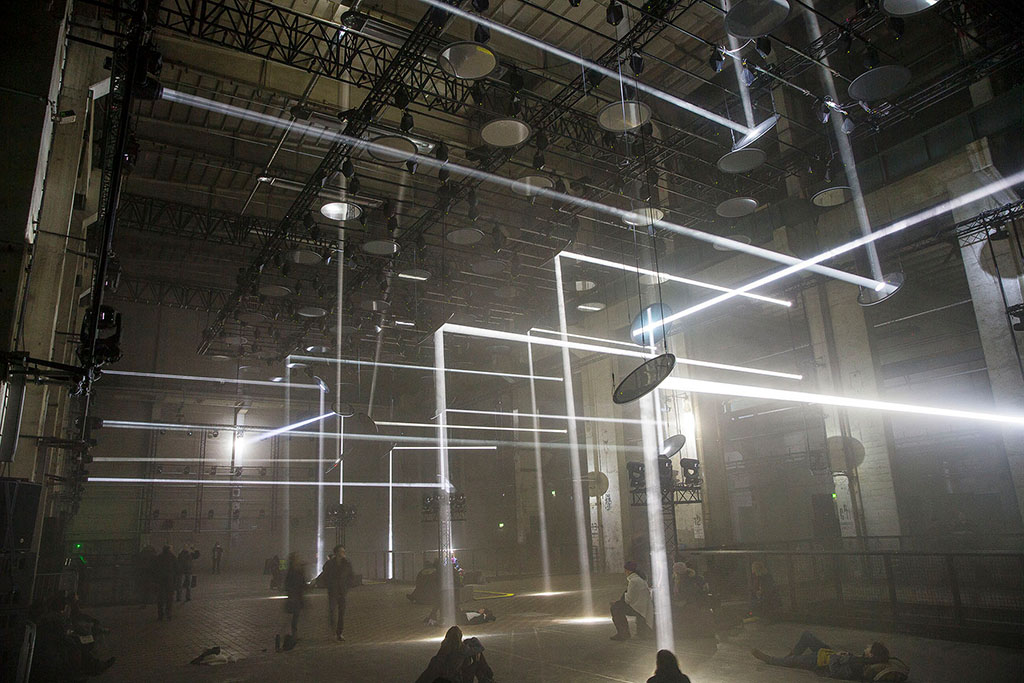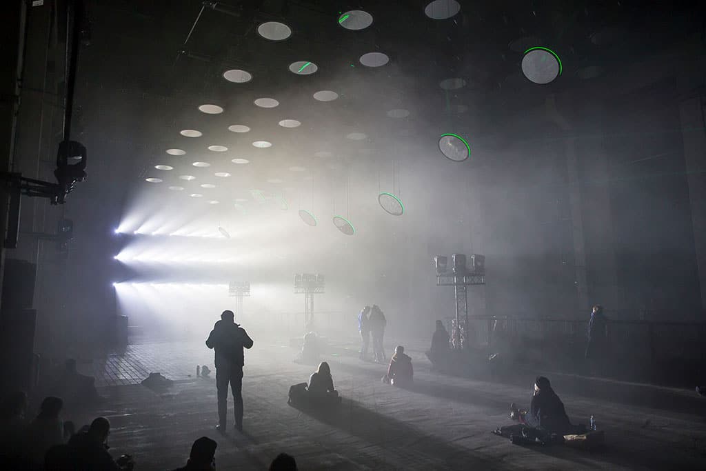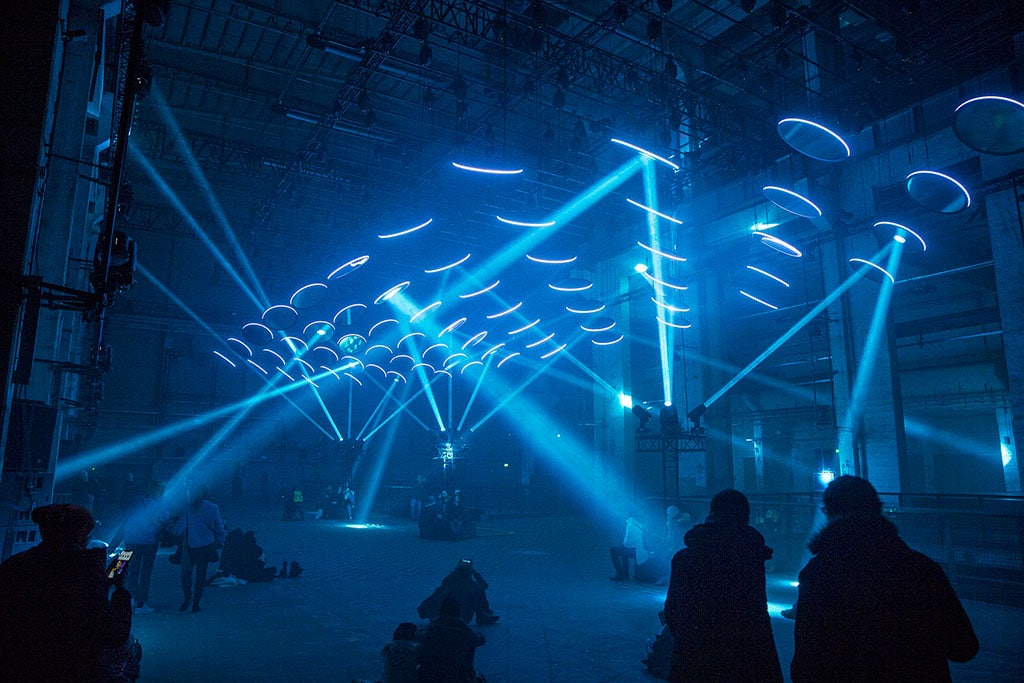 Skalar selbst befindet sich in der ehemaligen Turbinenhalle im dritten Stock des Kraftwerks, die neben einer Veranstaltungsfläche von 100 x 40 Metern zudem eine Deckenhöhe von 25 Metern bietet. Dimensionen, die in Christoph Bauder den Ehrgeiz weckten, ein einmaliges Werk zu gestalten, das ausschließlich auf Licht basiert. Ende November 2017 dann die Zusage der Veranstaltungshalle, dass die Location Ende Februar verfügbar sei. Trotz kurzer Vorlaufzeit startete Bauder umgehend mit der Planung und legte den Grundstein für Skalar. Dass das Konzept für die Location maßgeschneidert werden musste, war Bauder und Ray schnell klar: „Mit der Location kann man nicht verhandeln. Der Deal ist, dass man sie an Bord nimmt und mit dem Respekt behandelt, den sie verdient, und Lösungen für Probleme wie den Hall und das spezielle Rigging findet.“