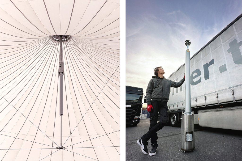 Skyliner, das ist auch das Lebenswerk von Felix Lenz, Inhaber und Geschäftsführer der kleinen mittelständischen GmbH im bergischen Overath. Inspiriert von Open-Air-Überdachungen aus Fallschirmstoff mit Baukran als Träger entwickelte er 2006 sein erstes polygonales Groundsupport mit Dacheindeckung und Standsicherung. „Die Möglichkeit eines Systems mit selbsttragender Dachmembran hat mich schon immer fasziniert“.
