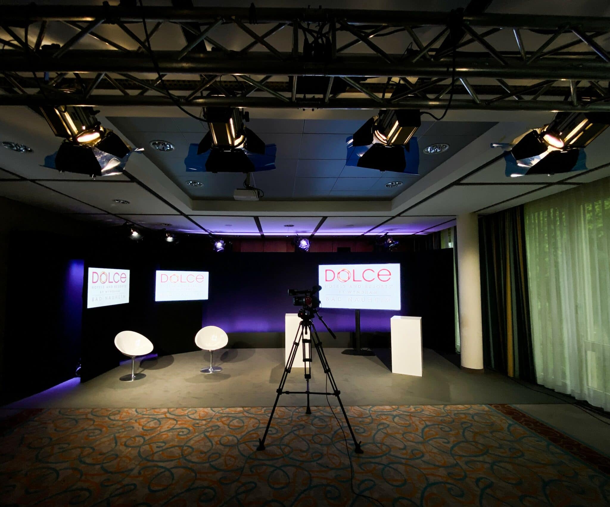 State-of-the-Art-Technik ist für Veranstaltungen während der Corona-Krise unerlässlich. Das Dolce by Wyndham Bad Nauheim hat daher seine entsprechenden Kapazitäten mit dem „Dolce Live-Studio – powered by satis&fy“ ausgebaut. Im permanent eingerichteten Studio im Hotel können nun jederzeit Live-Streaming-Events, hybride Meetings, Video-Konferenzen, Broadcast-TV-Sendungen realisiert sowie professionelle Studioaufnahmen aufgezeichnet werden. Das passende Equipment stellt satis&fy zur Verfügung. Bis zu vier Personen finden auf der Szenen-Fläche Platz, um beispielsweise Interviews zu führen, Webinare abzuhalten oder Talk-Runden zu streamen. Für hybride Meetings kann das Studio um 102 m2 für bis zu 25 Personen erweitert werden.